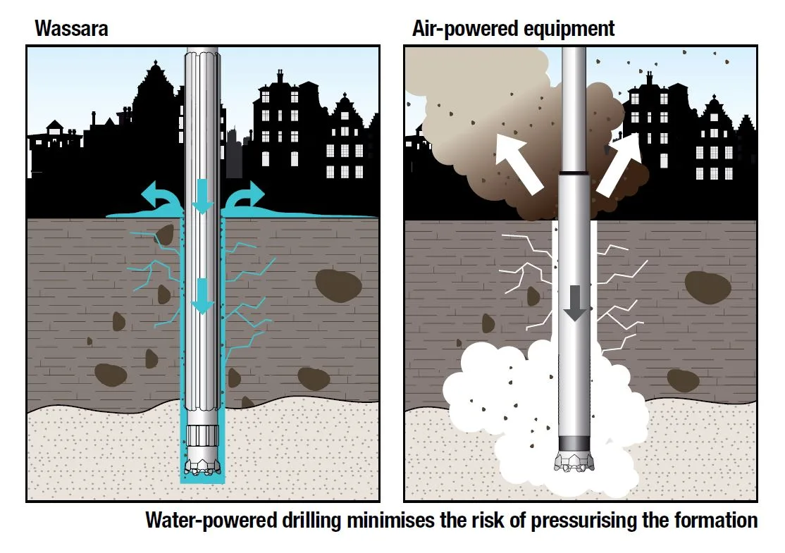 The complicated drilling project was successfully carried out in 2013, despite the fact that the surrounding downtown buildings were at risk if the formation was pressurised. Thanks to Wassaras water-powered DTH hammer, drilling passed without incident through the different formation layers.